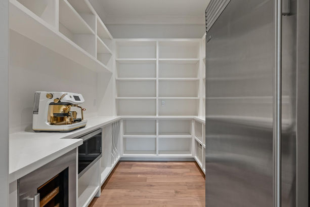 The pantry offers a separate Sub-Zero freezer with icemaker and extensive maple shelving and built-ins. Generous pull out storage, vegetable baskets and thoughtful organization enable cooks and caterers to be prepared for all occasions. Lakeside casual dining may be enjoyed from the adjacent sunroom with select walnut flooring, venetian plaster walls and wall of windows with unobstructed lake views.